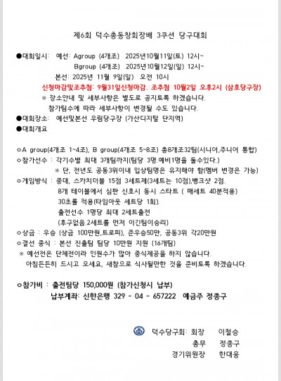 2025년 덕수총동창회배 3쿠션 당구대회가 아래와 같이 개최되오니 많은 관심과 참여 부탁드립니다