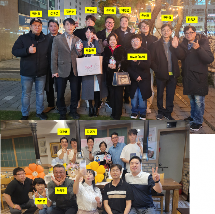 총회 이후 이어진 뒷풀이 자리에서는 박영민 동기가 정성스럽게 준비한 선물을 참석자 전원에게 전달하며 더욱 훈훈한 분위기를 더했습니다. 또한 이애자 은사님의 생일을 함께 축하하며 화기애애한 송년의 시간을 나누었습니다. 특히 김용은 동기의 배려로 임직원 30% 할인 혜택을 적용받아 풍성한 식사를 함께할 수 있었으며, 이어진 2차 자리에서는 이애자 은사님의 경기외국어고등학교 IB교육부 교감 승진을 축하하는 뜻깊은 승진턱도 함께하며 기쁨을 나누었습니다.