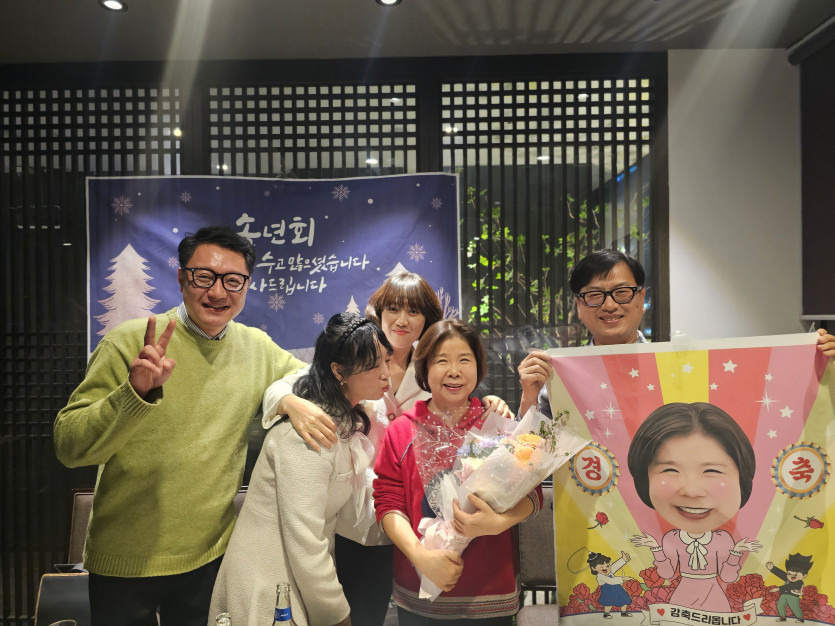 총회 이후 이어진 뒷풀이 자리에서는 박영민 동기가 정성스럽게 준비한 선물을 참석자 전원에게 전달하며 더욱 훈훈한 분위기를 더했습니다. 또한 이애자 은사님의 생일을 함께 축하하며 화기애애한 송년의 시간을 나누었습니다. 특히 김용은 동기의 배려로 임직원 30% 할인 혜택을 적용받아 풍성한 식사를 함께할 수 있었으며, 이어진 2차 자리에서는 이애자 은사님의 경기외국어고등학교 IB교육부 교감 승진을 축하하는 뜻깊은 승진턱도 함께하며 기쁨을 나누었습니다.